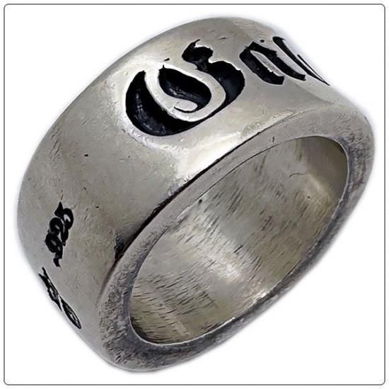 ブランドロゴがそのまま深く彫り込まれたシンプルなリング。筒を大胆に切り落とした様な印象を受けるシルエットでありながら、横から見た際に側面の中央部分が少し内側にシルエットラインが入っており昔からその然りげ無いシルエットに魅了される方々も多いリング。無骨に磨き上げられたその鈍く輝く銀の表面はハンドメイドから生み出される温かみも感じる。特徴的な自体が用いられガボラトリーのアイテムである事を然りげ無い中でも主張するワイド幅のリング。こちらのナロー幅(細い幅)のリングもリリースされている。一般的には中指、薬指などに着用される方々も多いが、敢えて小指(ピンキーリング)に着用される方々もいらっしゃるほど。中指や薬指に一点のみで着用すればフォーマルスタイルの中にも上手く溶け込んでくれるリングである。