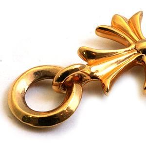 クロムハーツの非常に美しい22Kゴールドを使用したチャーム。昔からの定番モチーフで古くからのファンも非常に多い。ベイビーファットの様なミニマムサイズも良いがやはり少し迫力に欠けるところなので男性としてはこのぐらいのボリュームは欲しいところ。更にセンターには大粒のダイヤを設置する事により唯一無二のハイエンドモデルに仕上がった…。ダイヤとゴールドが繰り出すコントラストは見るものを圧倒する。昔はクロムハーツのチャームにはシルクの紐が付いてきたが現在は廃盤の為別売りのチェーンを買うなどの後付が必要である。その際ただ通しただけではモチーフが正面を向かないのでコレを嫌う方は多いが革紐と同じように細身のチェーンを結んでしまえば解決する。迫力ある大粒のダイヤから生えるように伸びた華麗なクロスが美しい。