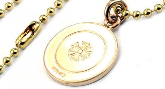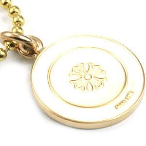 一時訪れたアンティーク・ジュエリーのムーブメント。それよりも少し前よりクロムハーツが新作としてドロップしたのが、このエンジェル・メダルである。2人の天使がダガーを中央に向かい合うデザインは、クロムハーツ本来の中世ゴシックのアレンジメントを忠実に受け継いだもので、本来ポストカードやTEEシャツのプリントなどに使われていたデザインである。クロムハーツ=ハードというイメージがまだまだ強かった時代、そのミニマルなスタイルは徐々にシーンに広がりクロムハーツというブランドの持つ性格の奥深さを見せ付けた。厳かにシリアスにまとめられた絵画の様なモチーフが中央に丁寧に作られている。厚み、大きさどれをとっても邪魔にならないライトな作りで、この辺がクロムハーツが他の大味なアメリカブランドと決定的に違うところである。世界中で日本人しか持ち得ない「退廃、滅びの美学」をアメリカという国ならではのカルチャーで表現している唯一無二のブランドである。バックサイドは派生デザインであるV1とV2とは違ったデザインワークとなっており、特別感もひとしお。より純度の高い22Kゴールドはそこらにある18Kとは違いゴールド本来の赤みを帯びた色で輝く。本物の中の本物を是非、見分けて身に着けて欲しい。アンティークの雰囲気をかもし出すコイン型のチャーム。大人のアイテムとして胸元を飾る。均一なCHプラスが刻印される、純金に近い22Kゴールドを使用した至高の一品。赤みを帯びた上品なカラーが特徴です!