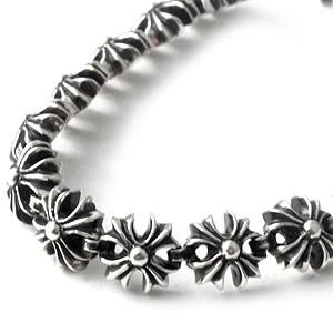 適度なバランスが美しいCHプラスをリンクさせた華麗なブレスレット。華奢に見えるが程良いボリュームを持っており、日本人男性の手首には丁度いいさりげない大きさ。一見してクロムハーツと解る世界観を持つ普遍的な作品。さりげなく高度な技術が用いられたリンク(連結)部分にも注目してほしい。少し肉厚のCHプラスモチーフが並ぶ様子はまさにクロムハーツのイメージそのもの。ヨーロッパゴシックをここまでアメリカナイズさせて一般にまで広げた同ブランドの功績は計り知れず、そのメインモチーフを冠するモデルだけに是非とも手に入れてほしいアイテムの一つです。国内にてあまり見かけないのもお勧めの理由の一つ。