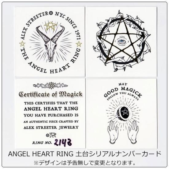 1971年に設立されたアレックスストリーター。1987年に制作されたアメリカ映画「エンゼルハート」でロバートデニーロが悪魔を崇拝している象徴として着用したエンジェルハートリングでアレックスストリーターを代表するアイテムであり、ミュージシャンの「マリリンマンソン」、「マドンナ」、日本のミュージシャンでは「hyde/ハイド」氏が愛用している事でも有名な名作リング。