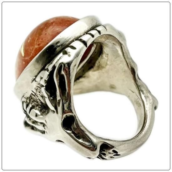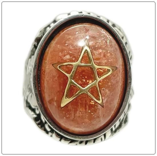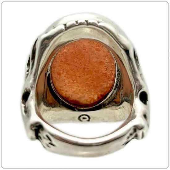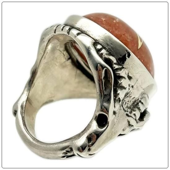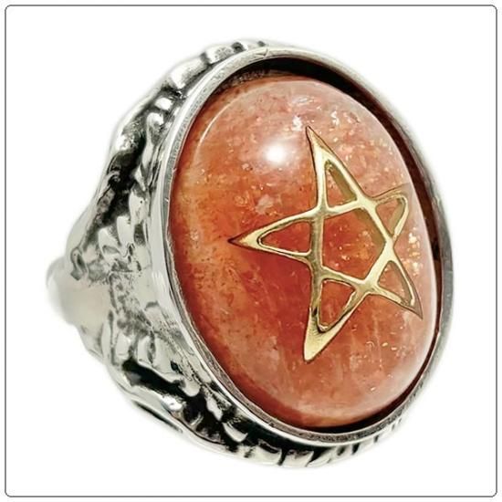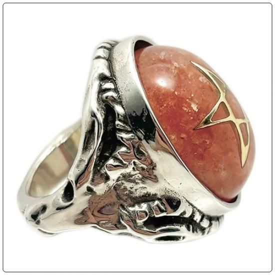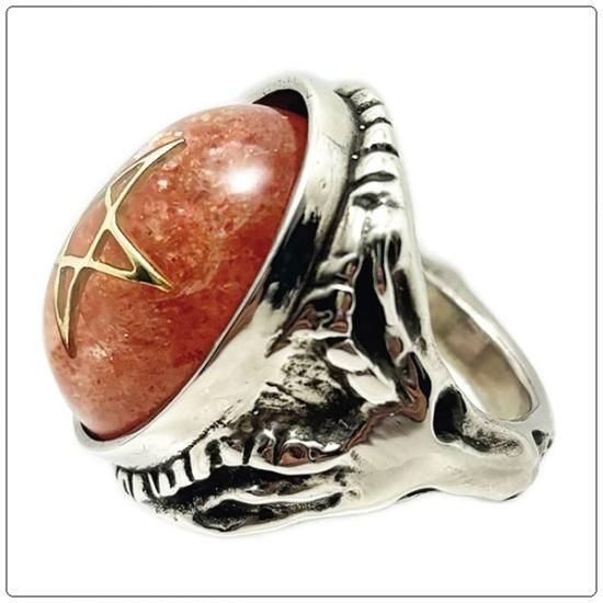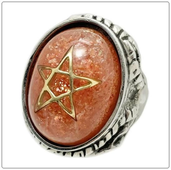 深い赤とオレンジの色合いが美しい天然石サンストーンがセットされています。